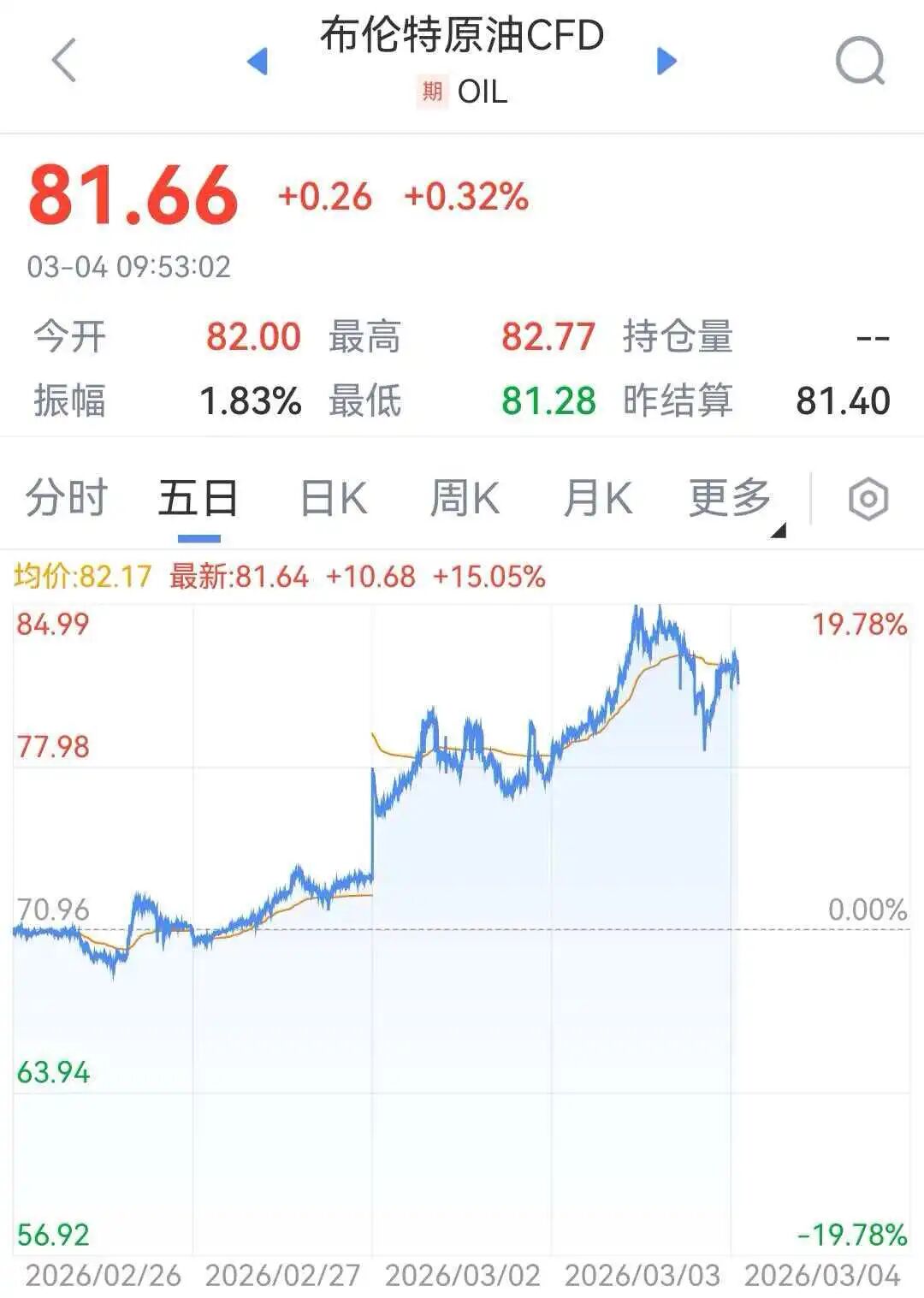 博弈也已投射在原油期货盘面。3月2日开盘,布伦特原油期货一度飙升近13%至每桶82美元左右;3月3日更是一度涨破每桶85美元,涨幅超9%。截至发稿,报每桶81.66美元。