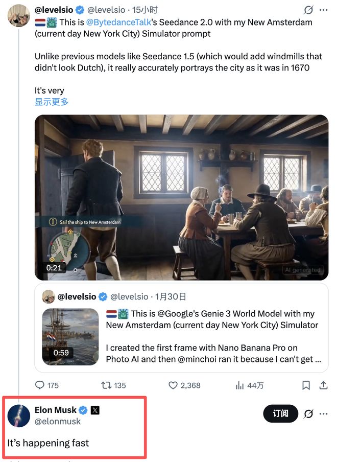 Seedance 2.0在开启内测后,凭借多模态创作方式与“自带运镜”的呈现效果,在全球范围内引发高度关注。马斯克在X的转发与“It's happening fast”评论,使得该模型的传播从技术圈层进一步扩散到更广泛的科技投资与产品关注人群。