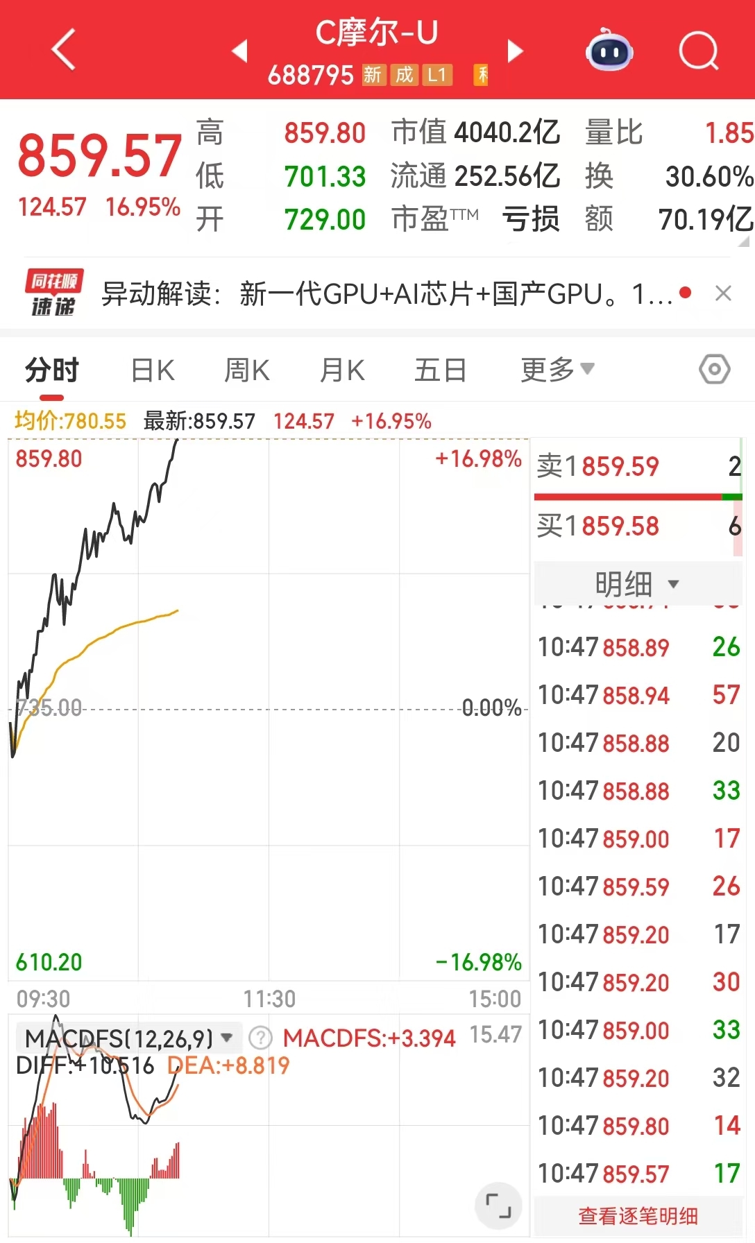 12月11日,“国产GPU第一股”摩尔线程(SH688795)股价快速拉升,截至发稿,摩尔线程涨近17%,报859.57元,总市值达4040.2亿元。