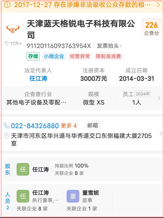 2014年3月31日,逃犯钱志敏彻底抹去“李霞”身份,化名为“花花”,用过去骗来的钱财,在天津注册成立了蓝天格锐电子科技有限公司,摇身一变为女霸总。