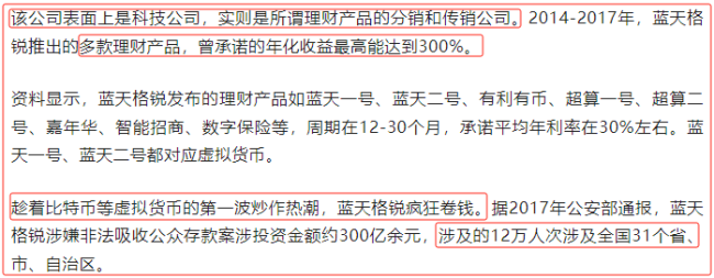 “花花”女霸总瞄准这一点,对外抛出能给出投资人两倍,甚至数倍的回报。资料显示,从2014到2017年,蓝天格锐推出的多款理财产品,承诺年化收益最高达300%。