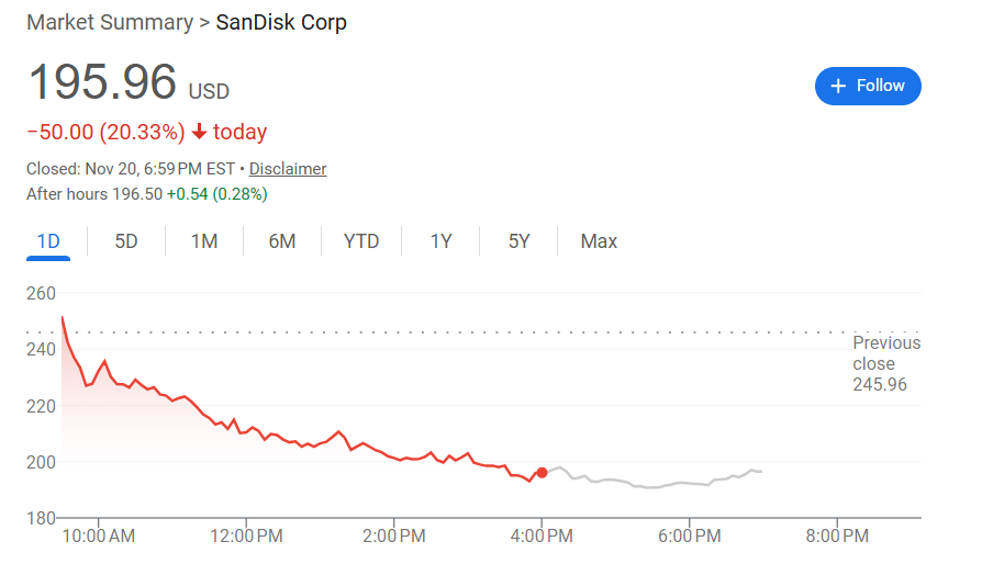 周四,存储芯片制造商闪迪的股价暴跌约20%。该股在科技板块整体抛售、工厂成本担忧以及对NAND闪存涨势能否持续的焦虑等多重压力下,回吐了此前的涨幅。