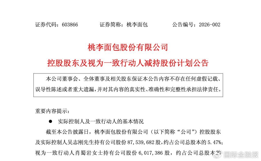 2月25日盘后,桃李面包(603866.SH)公告披露,公司实际控制人吴志刚及其一致行动人肖蜀岩(吴志刚儿媳)计划在未来3个月内减持公司股份,合计减持比例不超过总股本的3%。