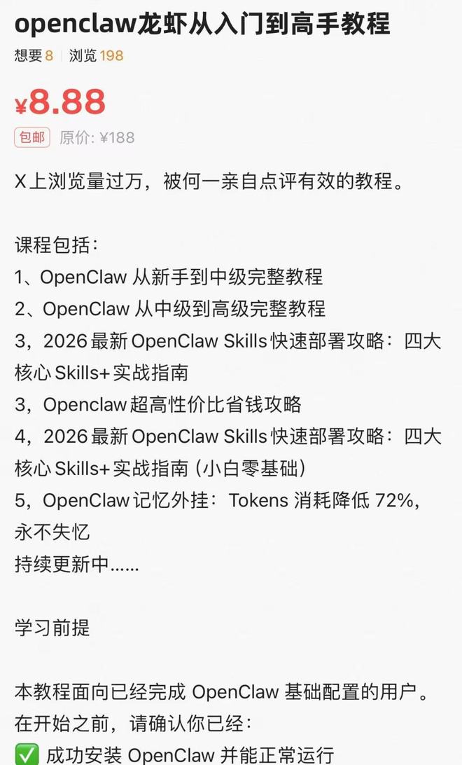 除了安装与卸载,二手平台上,个人卖家也推出了“从入门到高手”的OpenClaw教程,售价8.88元。课程内容包括OpenClaw从新手到中级完整教程、从中级到高级完整教程、四大核心Skills和实战指南、OpenClaw记忆外挂令Token消耗降低72%等。另一款售价99元的OpenClaw训练营计划“通过7天系统集训、四大教练全程带练”,教学“副业变现思路”,带消费者“抓住AI时代红利”。