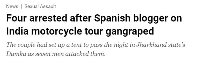 此前2024年3月,一对骑摩托的西班牙游客在印度露营时,被多名男子袭击并强奸,事后多人被捕——这是更严重的一次事件。