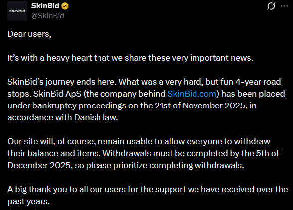 怀着沉重的心情,我们向大家分享这一重要消息。SkinBid 的旅程到此结束。艰难但愉快的四年走到了终点。SkinBid ApS(运营 SkinBid.com 的公司)已于 2025 年 11 月 21 日根据丹麦法律进入破产程序。