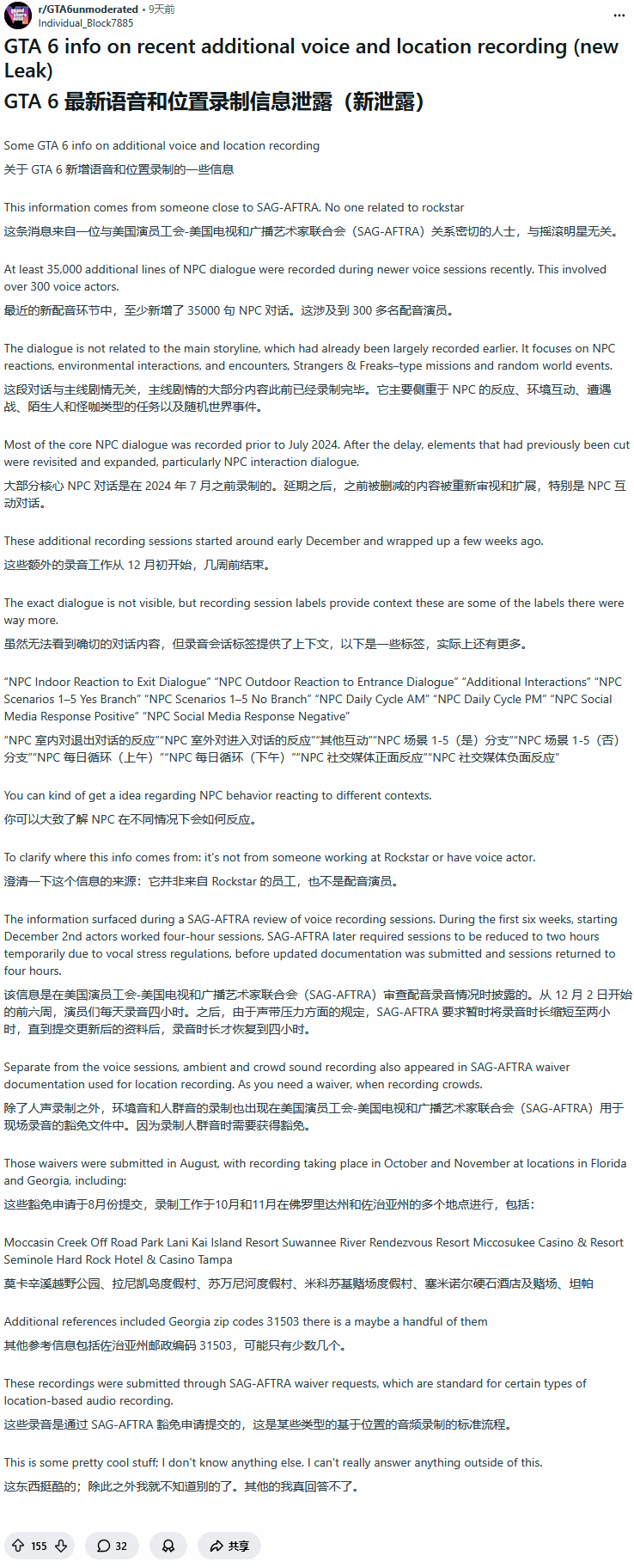 据介绍,在最近的新一轮语音录制中,至少新增录制了约35000条NPC对话,涉及超过300名配音演员。这些对话与主线剧情无关(主线内容早已基本录制完成),主要集中在NPC反应、环境互动、遭遇事件,以及类似“陌生人与怪咖”(Strangers & Freaks)的任务和随机世界事件上。