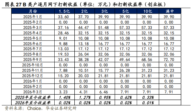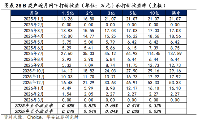 参照5.1中的测算方式,在不同规模B类户下,假设所有股票报价均入围,在90%的资金使用效率下,将2025年以来每个月网下打新可获得的收益相加,测算理想情况下逐月打新收益和打新收益率。以新股卖出日为统计时间,2026年至今B类2亿打新收益率0.32%,2025年至今B类2亿打新收益率3.20%。