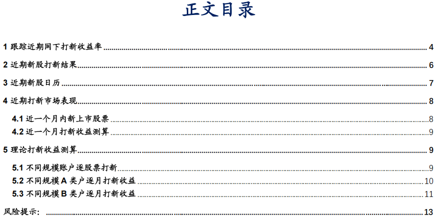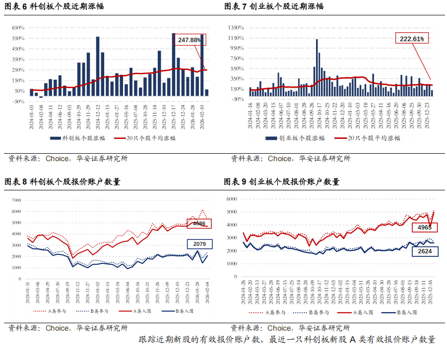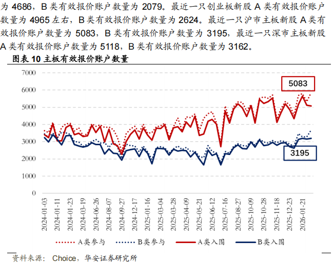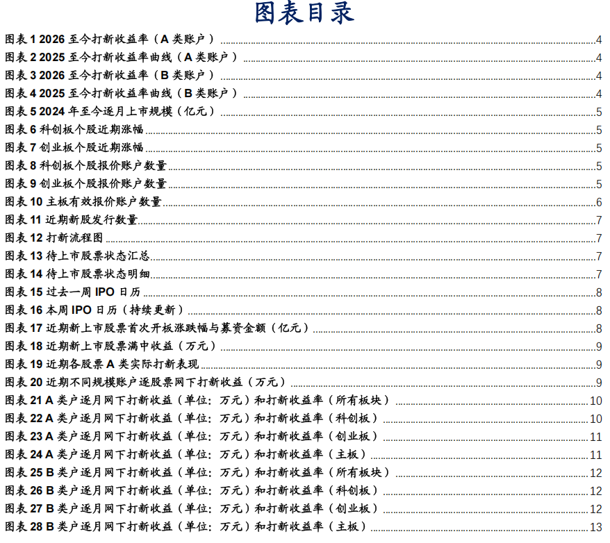 跟踪近期科创板+创业板+主板的网下打新市场表现,假设所有主板、科创板、创业板的股票都打中,且上市首日以市场均价卖出,忽略锁定期的卖出限制,2026年截至3/13,A类2亿规模账户打新收益率0.35%,B类2亿规模账户打新收益率0.32%;A类10亿规模账户打新收益率0.18%,B类10亿规模账户打新收益率0.16%。滚动跟踪近期20只新股上市后的涨幅表现,其中科创板个股上市首日平均涨幅为247.88%,创业板个股上市首日平均涨幅为222.61%。跟踪近期新股的有效报价账户数,最近一只科创板新股A类有效报价账户数量为4686,B类有效报价账户数量为2079。最近一只创业板新股A类有效报价账户数量为4965左右,B类有效报价账户数量为2624。最近一只沪市主板新股A类有效报价账户数量为5083,B类有效报价账户数量为3195,最近一只深市主板新股A类有效报价账户数量为5118,B类有效报价账户数量为3162。