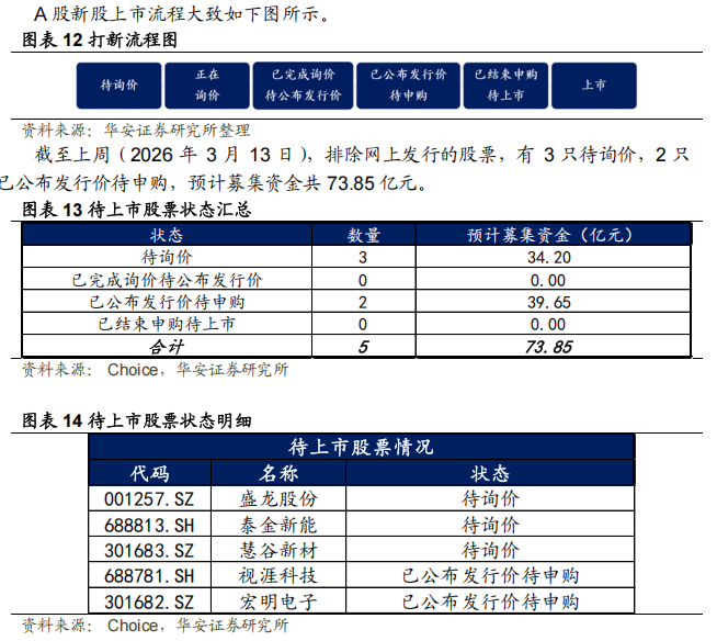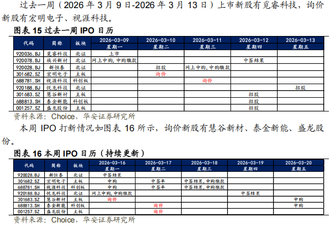 本报告摘自华安证券2026年3月17日已发布的《【华安证券·金融工程】金工周报:节后上市节奏逐步恢复,本周三只新股询价》,具体分析内容请详见报告。若因对报告的摘编等产生歧义,应以报告发布当日的完整内容为准。
