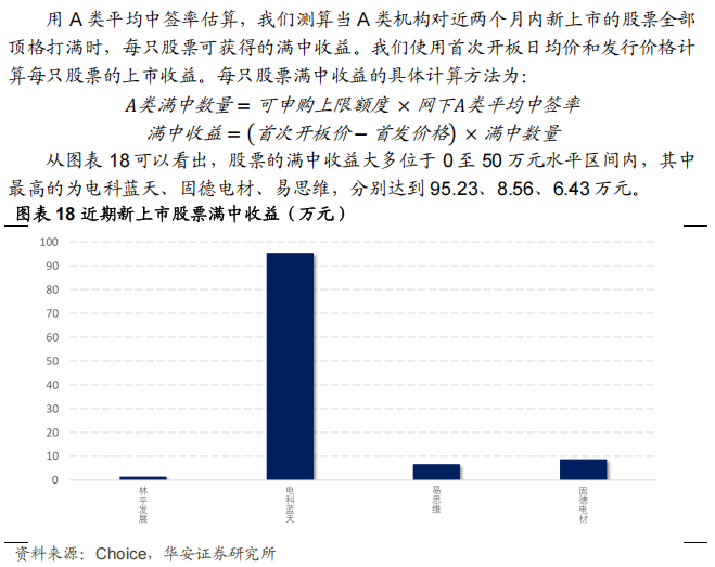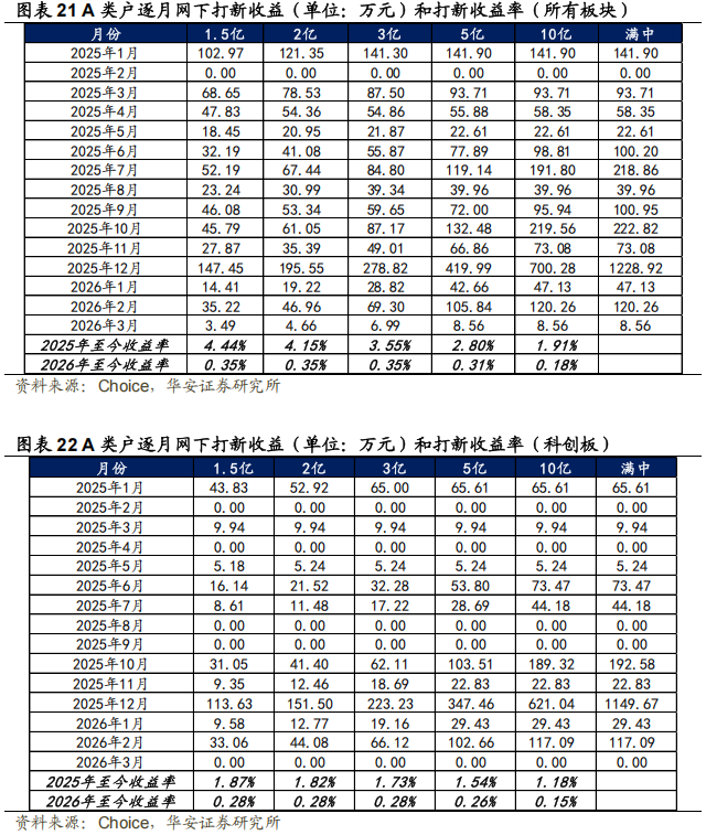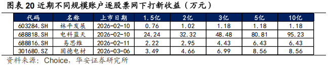 我们测算了不同规模资金的网下A类打新收益。假设使用网下A类平均中签率、账户参与所有新股打新、科创板和创业板报价全部入围、资金配置一半沪市一半深市且股票满仓、按首次开板日均价卖出、在90%的资金使用效率下我们测试不同账户规模下的逐股票网下打新收益。图表20列举了在1.5亿、2亿、3亿、5亿、10亿账户规模下,以A类平均网下中签率为例,假设科创板和创业板全部入围,近一个月内(2026年2月10日至2026年3月13日)上市新股的网下打新收益。