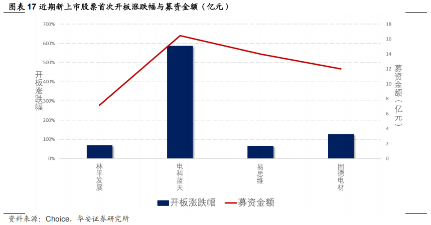 近一个月以来(2026年2月10日-2026年3月13日),大部分新上市股票的上市首日涨跌幅位于50%-600%水平区间内,上市首日涨跌幅最高的三家为电科蓝天、固德电材、林平发展,分别达到585.75%、126.30%、68.24%。大部分新股募资金额位于5-20亿元水平区间内,其中募资金额最高的三家为电科蓝天、易思维、固德电材,分别为16.45、13.99、12.01亿元。