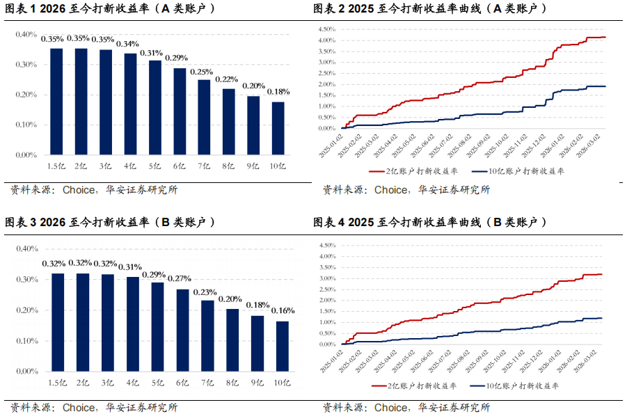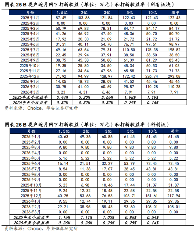 我们跟踪近期科创板+创业板+主板的网下打新市场表现,假设所有主板、科创板、创业板的股票都打中,且上市首日以市场均价卖出,忽略锁定期的卖出限制,2026年截至3/13,A类2亿规模账户打新收益率0.35%,B类2亿规模账户打新收益率0.32%;A类10亿规模账户打新收益率0.18%,B类10亿规模账户打新收益率0.16%,如图表1、图表3所示,2025年以来的累计打新收益率曲线如图表2、图表4所示,A类分多档询价的股票以A类平均中签率计算打新收益率。