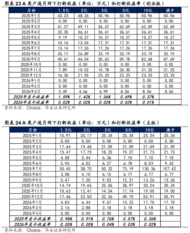 参照5.1中的测算方式,在不同规模A类户下,假设所有股票报价均入围,在90%的资金使用效率下,将2025年以来每个月网下打新可获得的收益相加,测算理想情况下逐月打新收益和打新收益率。以新股卖出日为统计时间,2026年至今2亿打新收益率0.35%,2025年至今2亿打新收益率4.15%。