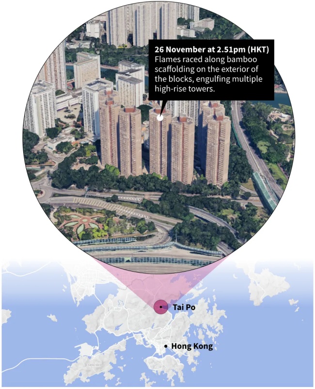 有8栋建筑物的位于新界大埔的屋邨宏福苑(共1984户)里有7栋发生火灾,这已导致至少44人死亡,58人受伤(超过20人在住院)。