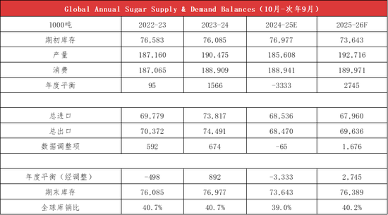 国际糖价维持单边下跌几乎贯穿全年, ICE原糖期货主力合约创四年新低,这主要来自于供给的压力,在23年以来巴西甘蔗连续丰产之后,分析机构Expana预测印度新季产量有望增加500万吨产量,全球的糖产量有望达到1.93亿吨,年度平衡将从330万吨的缺口转向270万吨过剩,这是至少8年以来全球糖市最严峻的过剩压力。