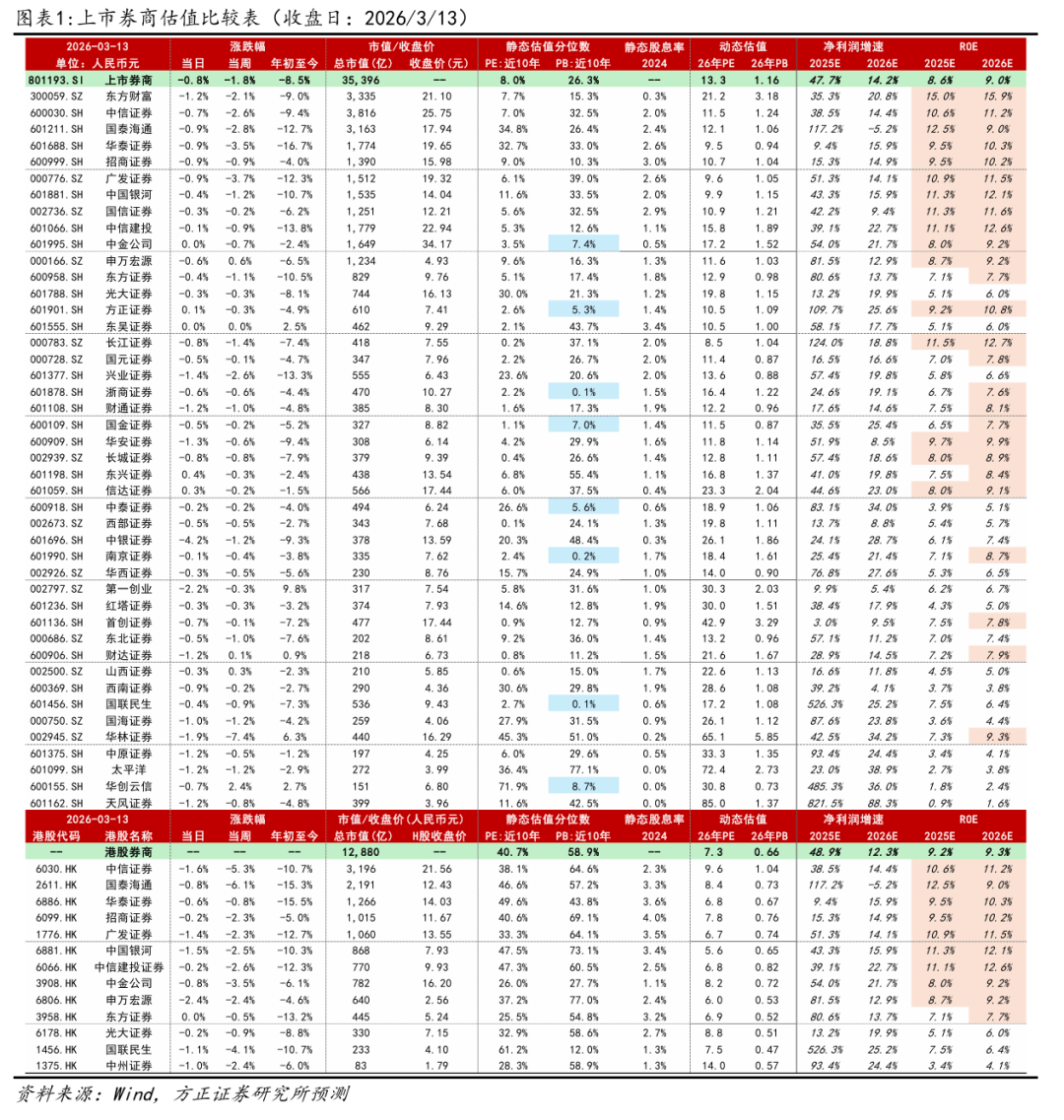 行业一流投行建设稳步推进,进一步并购整合可期。25年12月,证监会主席吴清在中证协第八次会员大会上表示,“要进一步增强资源整合的意识和能力,用好并购重组机制和工具,实现优势互补、高效配置,力争在“十五五”时期形成若干家具有较大国际影响力的头部机构”。26年3月,十五五规划纲要正式公布,就加快建设金融强国进行部署,明确“培育一流投资银行和投资机构”,并购可提升行业经营效率、释放协同效应,有望成为一流投行建设的核心引擎,后续中大型券商并购重组仍可期。