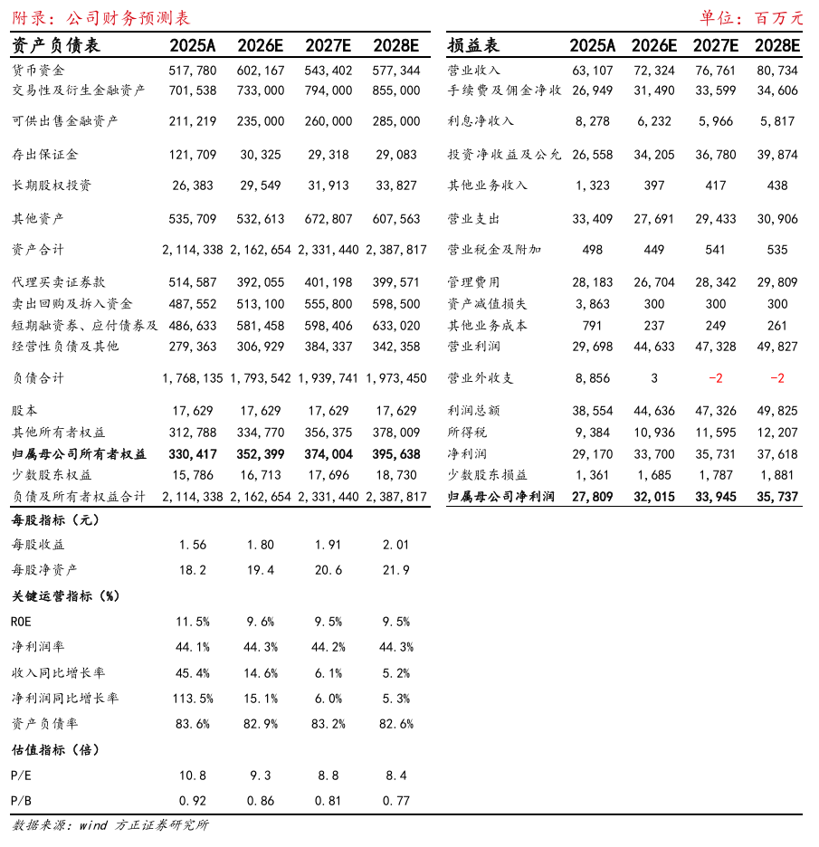 投资管理规模稳健增长。券商资管看,合并进展顺利,业务平稳过渡,25年末资产管理规模7507亿/yoy+7.9%。公募基金看,华安基金(控股51%)25年实现营收34.9亿/yoy+12.3%,净利润9.6亿/yoy+5.6%,25年末资产管理规模8883亿/yoy+15.0%;海富通基金(控股51%)25年实现营收13.3亿,净利润4.9亿,25年末资产管理规模5656亿/yoy+25.1%;富国基金(持股27.8%)25年实现营收68.5亿,净利润19.2亿,25年末公募基金管理规模13521亿/yoy+24.4%。