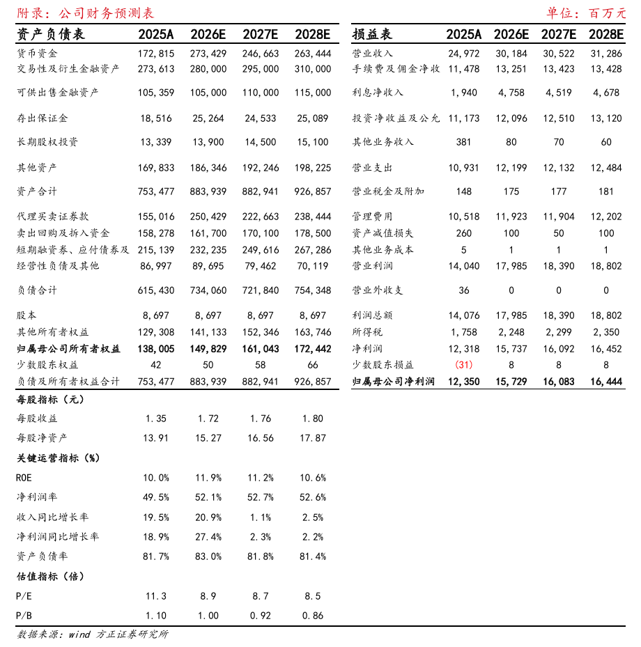 经纪及净利息收入高增。全年看,公司2025年经纪、投行、资管、净利息、投资(含汇兑)分别实现收入88.9、10.3、8.7、19.4、98.2亿元,分别同比+44%、+20%、+22%、+71%、+1.7%,收入占比分别为36%、4.2%、3.5%、7.9%、40%。单四季度看,公司4Q25经纪、投行、资管、净利息、投资(含汇兑)分别实现收入22.9、5.2、2.2、6.6、25.1亿元,分别同比-8.6%、+19%、+2.3%、+46%、+4.9%