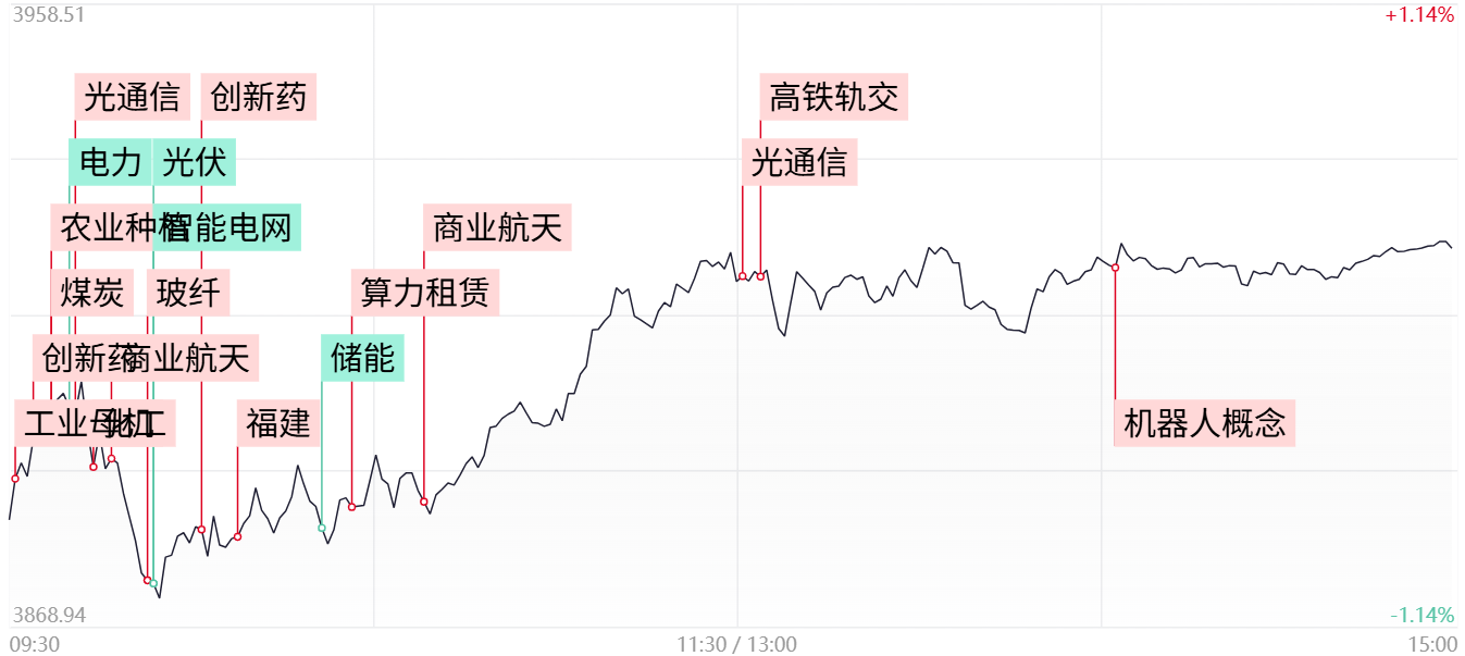 财联社3月30日讯,市场探底回升,三大指数涨跌不一,沪指拉升翻红,此前一度跌超1%,创业板指、深成指跌幅收窄。沪深两市成交额1.92万亿,较上一个交易日放量626亿。盘面上,市场热点快速轮动,整体涨多跌少,全市场超2800只个股上涨。从板块来看,医药板块反复活跃,美诺华走出7天6板,津药药业、联环药业双双2连板。商业航天概念探底回升,神剑股份3连板,再升科技4天3板,广联航空、航天动力等涨停。有色·铝方向全天走强,闽发铝业、常铝股份等涨停。光纤概念盘中持续走高,长飞光纤走出5天3板,续创历史新高,杭电股份4天3板,法尔胜2连板。下跌方面,电力股大幅下挫,华电能源、晋控电力、豫能控股跌停。截至收盘,沪指涨0.24%,深成指跌0.25%,创业板指跌0.68%。
