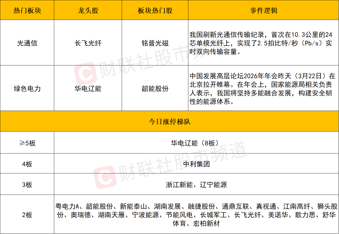 财联社3月25日讯,市场震荡反弹,沪指涨超1%重回3900点上方,创业板指涨超2%。沪深两市成交额2.18万亿,较上一个交易日放量970亿。盘面上,市场热点快速轮动,全市场超4800只个股上涨,其中105只个股涨停,连续2个交易日百股涨停。从板块来看,电力板块爆发,绿电概念领涨,十余只成分股涨停,华电辽能8连板,韶能股份6天5板,粤电力A走出6天4板。算力租赁概念走强,二六三、奥瑞德、利通电子、大位科技涨停。CPO概念表现活跃,铭普光磁、阿莱德、可川科技涨停。光纤概念震荡拉升,通鼎互联2连板,特发信息封涨停。下跌方面,油气股表现较弱,科力股份、通源石油下挫。截至收盘,沪指涨1.3%,深成指涨1.95%,创业板指涨2.01%