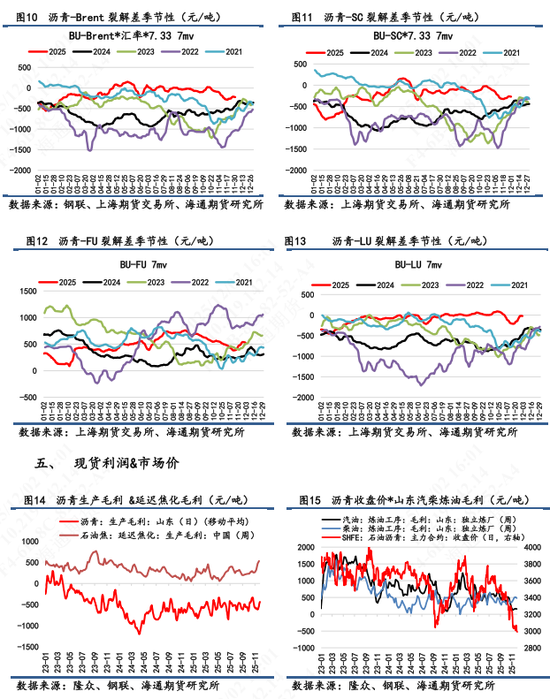 【4】基本面变化:目前来看,整体沥青正值冬季淡季,其基本面平淡无过多亮点。产量端,截止11月28日当周,国内炼厂产量为49.2万吨,环比增加12%;稀释沥青贴水12.1日数据录得-11.3美元/桶,贴水幅度依旧高位,意味着目前沥青供应处于宽松格局。需求端,冬季一般是沥青淡季,上周道路开工率下滑至29%,创下近6周以来的地位,南北方终端需求基本平淡。当下市场关注点放在成本扰动上,也即近期俄乌会谈是否会达成和平协议,一旦和平计划达成无疑将对油价形成冲击,进而带动沥青价格大幅跟跌。近期市场传言新疆个别主营炼厂释放冬储合同,贸易商考量当下价格,拿货积极性有所提升。但现货市场跌破3000元/吨,且持续阴跌,使得市场对冬储价格产生看跌心理或观望心理。后期还是依旧持续关注冬储行情变化。