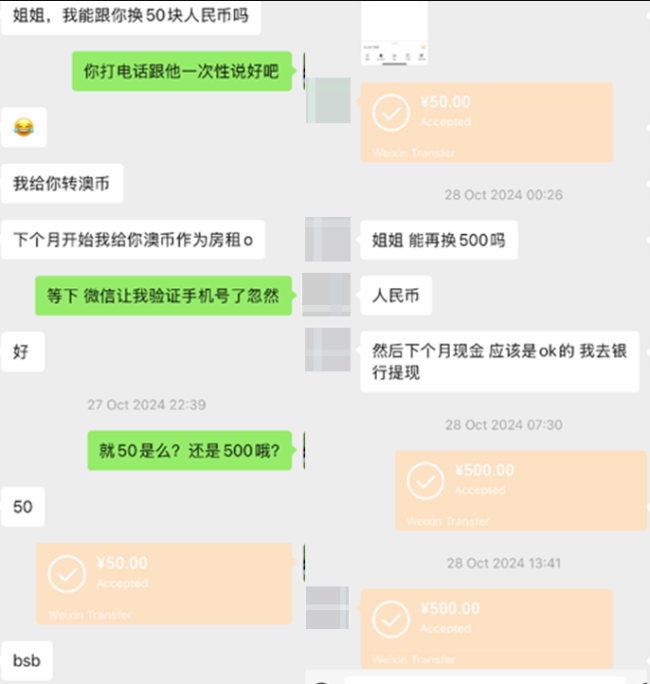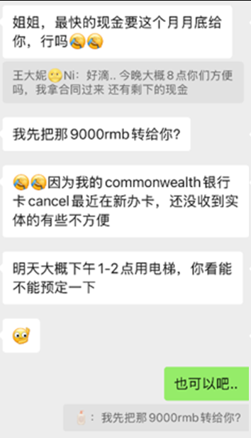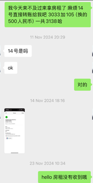 看房当天,她声称CBA银行卡出了问题,请求用微信转人民币支付押金和首月租金。