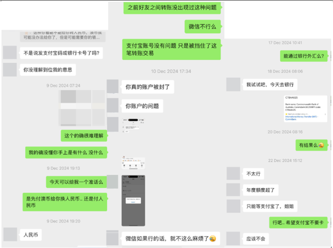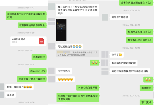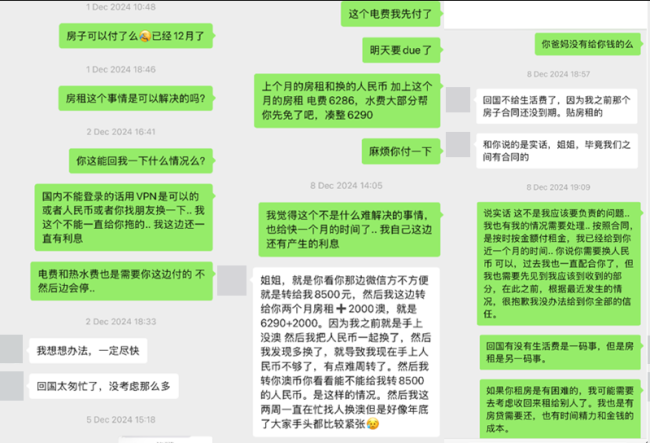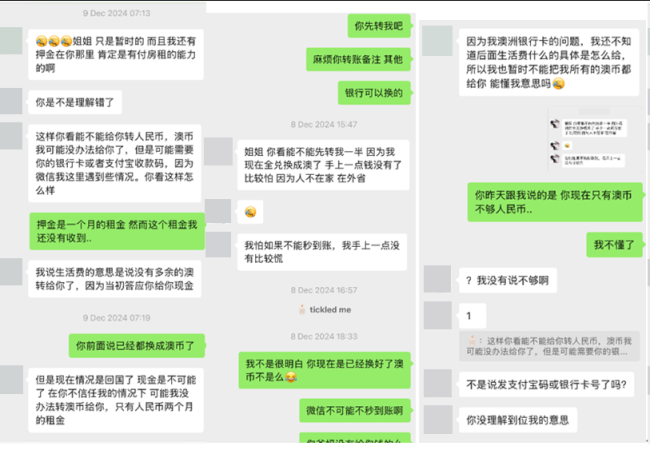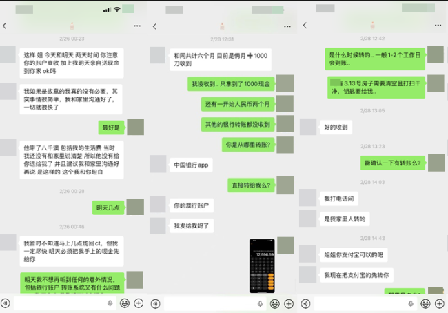 此后更是花样百出:导致房东的支付宝账户被封、声称个人外汇额度超限、多次承诺当面支付现金却让房东在寒冬深夜苦等到凌晨。