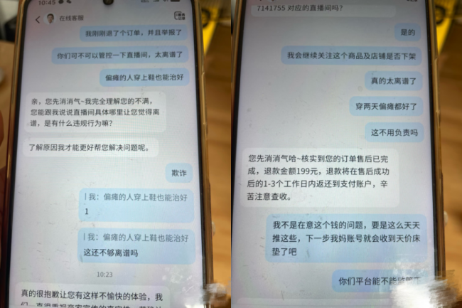王女士当即帮母亲退掉鞋子,并向抖音平台举报该主播。“我多次联系抖音在线客服和电话客服,但是双方都回复说我没有确切的证据,当时没有录屏,所以他们没有办法处理。”王女士说,“最终的解决方案就是给我七天无理由退款,后续我也没有收到抖音客服的任何反馈。”