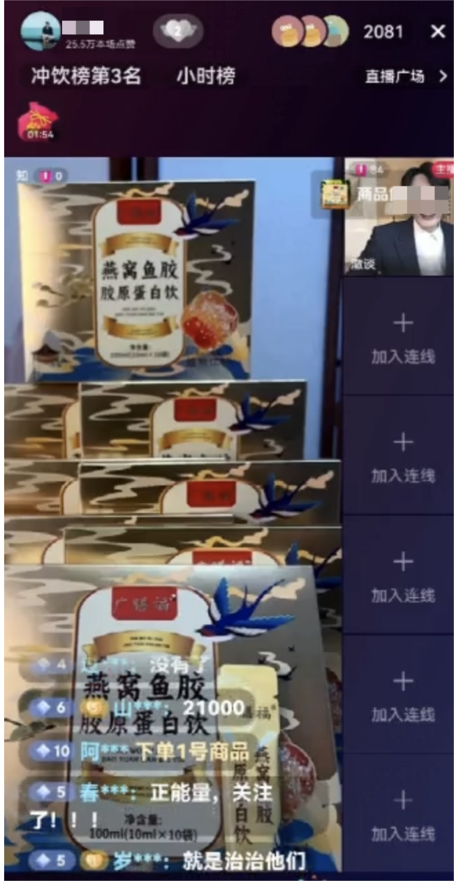 赵思韵重返直播间后介绍起一款“广膳福燕窝鱼胶胶原蛋白饮”,为规避直播规范,其特意将涉及功效的用词以“什么、小”等词汇隔开,称产品含燕窝、鱼胶,可改善肤质、抗细纹、提升免疫力。她扫码显示,每盒售价2680元,产品由安徽亳药千草中药科技有限公司生产。并称8盒为一疗程,成本价21000元。
