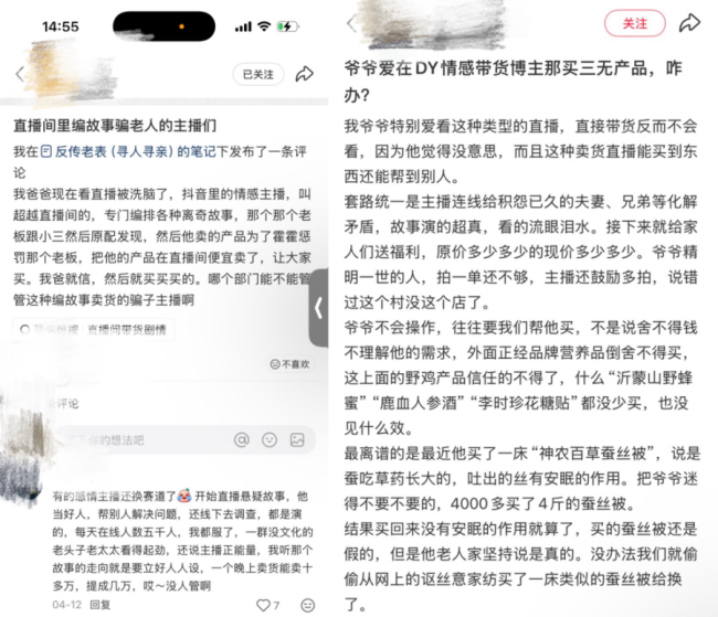 记者在社交平台搜索发现,有不少网友发帖吐槽,称自家老人频繁停留于情感主播直播间,主播以“正能量帮扶”、“家庭矛盾调解”为噱头拉近距离,随后便推销保健品、生活用品等,老人往往被话术打动盲目下单。