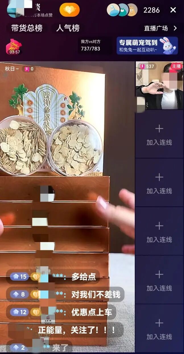 “直播中,第三者重点介绍了西洋参原浆饮、果蔬酵素、牡蛎锌镁硒片三款产品,称牡蛎锌镁硒片‘女性服用有益妇科健康,男性服用有助泌尿系统健康’。”骆女士表示,随后直播进入带货环节。主播称直播间有众多“有实力的老板”,随即指示助理将西洋参片上架。“主播说这款产品原价数千元,现场调价至288元,一直跟我们强调低于市场价、库存有限。”