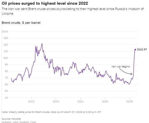 全球基准布伦特原油周五上涨 4.22%,收于 112.57 美元,创下 2022 年以来的最高水平。2 月 28 日美国和以色列袭击伊朗之前,布伦特原油价格约为每桶 73 美元。
