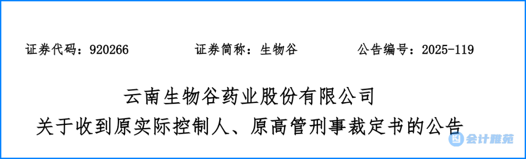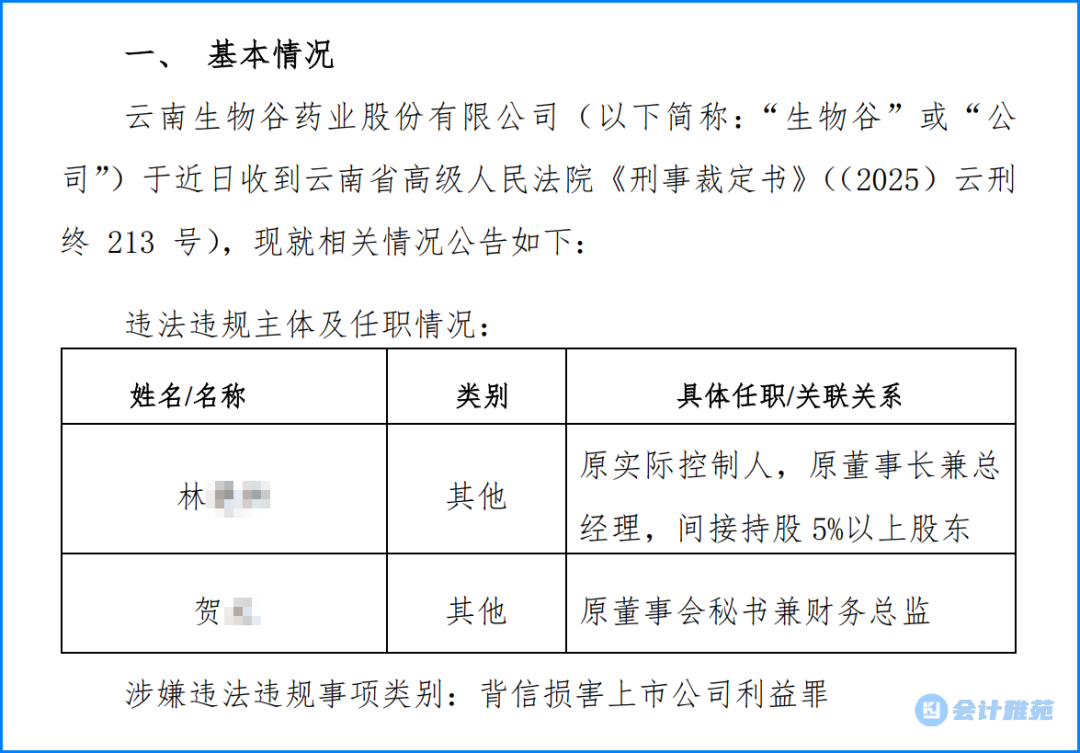 12月22日晚间,生物谷(证券代码:920266)公告称,公司近日收到云南省高级人民法院《刑事裁定书》,原实际控制人、原董事长兼总经理,间接持股5%以上股东林**及原董事会秘书兼财务总监贺*因背信损害上市公司利益罪,终审裁定驳回上诉,维持原判。
