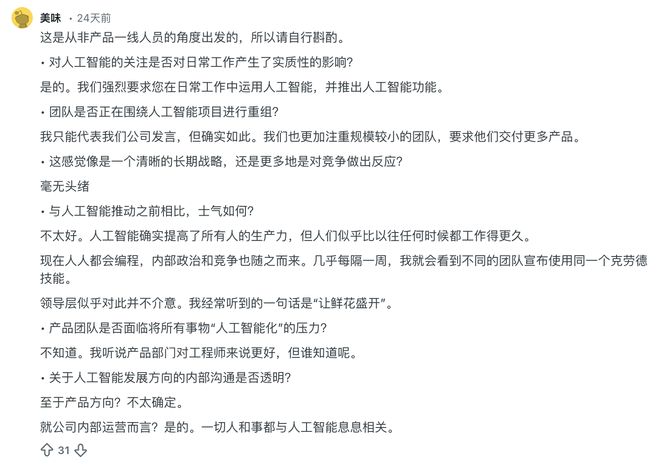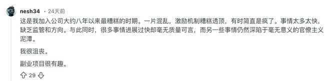 这种快到失控的节奏让很多人根本受不了。一位在公司干了8年的老兵(ID:nesh34)愤怒地表示,现在的公司简直疯了:“这是我加入以来最糟糕的一段时间。纯粹的混乱,糟糕透顶的激励机制,有时简直是疯了。太多东西推得太快,却没有护栏,也没有足够的指导。与此同时,很多东西速度太快却毫无质量,而另一些东西依然卡在毫无意义的官僚主义中。”