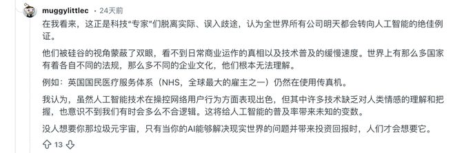而另一位叫muggylittlec的网友更是毫不留情地撕破了硅谷高管们的滤镜:“这些科技大牛太盲目了,他们觉得全世界所有的公司明天都会转向AI,但实际上,像英国国民医疗服务体系(NHS)这样的全球最大雇主之一,到现在还在用传真机!没人想要那个糟糕的元宇宙,人们只会在AI能解决现实问题并帮他们赚钱时,才会想要它。”
