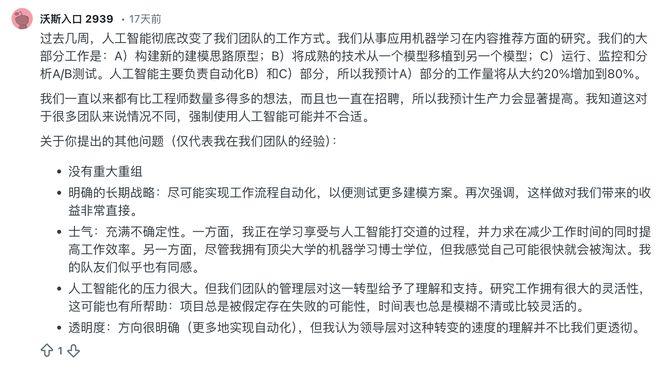 即便是那些手握顶级名校机器学习博士学位的资深研究员,如今也陷入了深深的生存危机。一位从事内容推荐应用机器学习(Applied ML)研究的专家(ID:Worth Entrance 2939)坦言,虽然AI帮他把那些无聊的测试工作自动化了,让他有80%的时间可以去琢磨新模型,但他和同事们心里依然发毛:“一方面,我正在学着享受与AI一起工作,希望能用更少的工作时间完成更多的事情。但另一方面,我甚至觉得自己很快就要过时了。我的队友们似乎也有同感。”