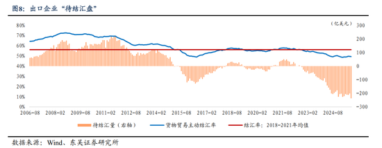 以商品贸易为主体的经常项目是人民币汇率的“压舱石”。回顾2022年至2024年人民币汇率升贬值历程,商品出口份额是否强势决定了人民币单边汇率和货币篮子的贬值幅度和波动率,并且商品净出口形成的“待结汇盘”,也成为2022年以来推动人民币汇率波动的主引擎之一。