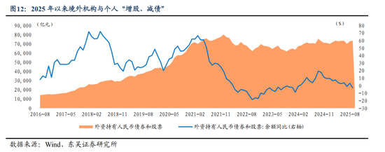 跨境资金年初以来持续增配人民币金融资产。尽管国际收支表中的资本与金融项目仍然保持逆差,截至2025年9月末,资本与金融结售汇累计逆差730.84亿美元,但是证券投资科目改变了2022年至2024年连续逆差的状态,截至2025年9月末,证券投资累计顺差105.71亿美元,结合人民银行公布的境外机构和个人持有的境内人民币金融资产,截至2025年9月末,外资年内累计增持6229亿元A股、减持3881亿元中债。