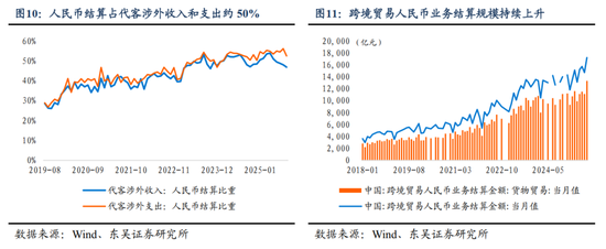 人民币国际化推动本币结算占比提高,推动人民币“脱敏”美元。人民币国际化兑现,或首先表现为在国际经贸往来中,人民币结算规模和比例提升,国际市场上包括铁矿石、原油等重要原材料在内的越来越多可贸易商品以人民币计价和结算。事实上,过去几年人民币国际化也正在稳步获得突破:跨境贸易中人民币业务结算金额稳定上升,2025年9月用于货物贸易的跨境人民币业务结算金额为1.33万亿元,而当月以人民币计价的进出口金额为4.04万亿元,当进出口贸易更多采用本币计价时,面临的美元汇率风险敞口自然下降。但是人民币国际化在消散美元汇率风险敞口的同时,也在增加非美货币的汇率风险敞口,人民币对一篮子货币汇率变化才更能准确度量对外贸易。