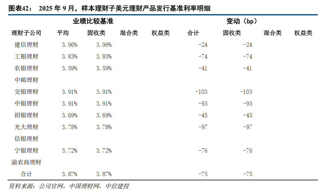 2025年前三季度,美元理财产品产品发行特征:量、价开始降。总结来看,2025年前三季度,美元理财产品的发行数量从8月开始降低,平均的业绩比较基准也从9月开始显著下降,主要原因包括:美联储9月降息,美元产品的风险指数在下降,同时期限结构也在缩短。