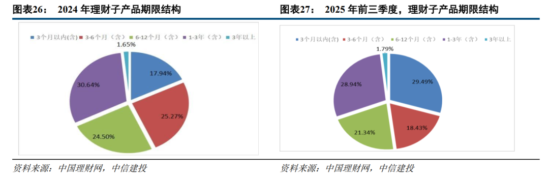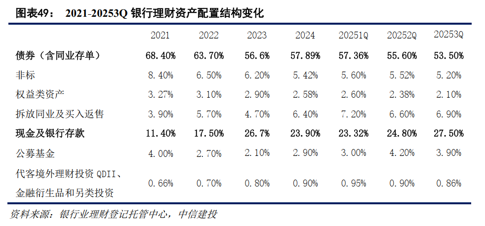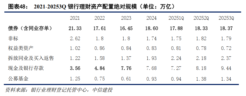 2)资产配置:理财的资产配置呈现一些新特征和面临的新问题:理财子及时兑现公募基金投资收益,提高现金及银行存款配置,越来越多的优先股在提前赎回。面对这些新特征,理财子2026年资产配置预计依然是兼顾安全性和收益性。流动性较高的资产(现金及银行存款、同业存单、同业存款及买入返售)占比会继续提高,而债券投资和非标资产占比会降低,但是公募基金和权益类资产占比也将提高。