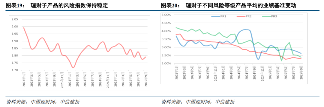 2025年前三季度,样本理财子产品发行特征。前三季度,产品发行呈现"总量回升、结构优化"特征;从趋势上看,月度发行节奏显著提高,但混合类产品占比下降;理财产品市场集中度延续下降趋势,市场结构持续优化。具体来看,头部机构格局发生显著变化,光大理财保持领先地位;机构发行策略分化明显,农商行理财子表现突出。前三季度,产品的平均业绩比较基准较2024年大幅下降, 混合类产品及固收类产品均跌入2.4%以内,理财产品平均的利差在持续下降,下降近67bps,而且在3季度降幅扩大。前三季度,理财子产品的风险等级依然主要集中在PR1与PR2,PR3及以上产品占比较低,而且占比下降,居民风险偏好呈现边际改善;产品整体平均风险指数为1.82,较2024年末下降0.3%。前三季度,产品期限结构呈现"两端增长、中间收缩"的特征。从样本理财子期限结构看,T+0和3年期以上产品是增量较多的产品,而且3个月以内产品和1-3年期产品占比最高。