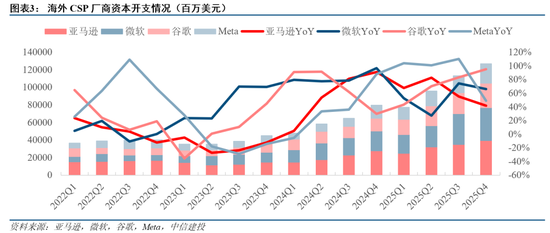 北美四家CSP厂商公布2025年四季度财报,资本开支保持强劲增长态势,同时各家均在电话会上表达了“AI需求旺盛,算力供应紧张”的观点,亚马逊、谷歌、Meta对2026年的资本开支指引乐观,超市场预期。北美四家CSP厂商2025Q4资本开支合计1270亿美元,同比增长60%,环比增长12%;全年资本支出4135亿美元,同比增长65%。亚马逊、谷歌、Meta对2026年资本开支的指引分别为2000亿美元、1750亿美元至1850亿美元、1150亿美元至1350亿美元,按中值计算,三家合计约为5050亿美元,同比增长71%。我们认为目前仍处于AI发展的较早阶段,算力基础设施建设适度超前是行业发展的规律,继续看好海外AI算力链。