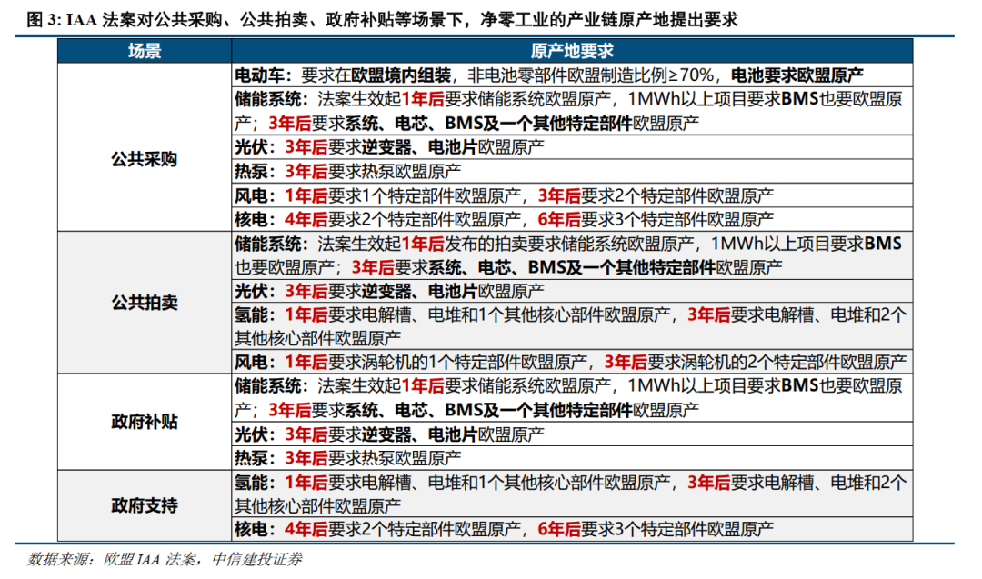 产业链本地化要求方面,IAA法案针对公共采购、公共拍卖、政府补贴等场景下,对电动车、储能、光伏、风电、氢能、核电、热泵等净零工业的产业链原产地提出相关要求,引导企业前往欧洲进行投资。