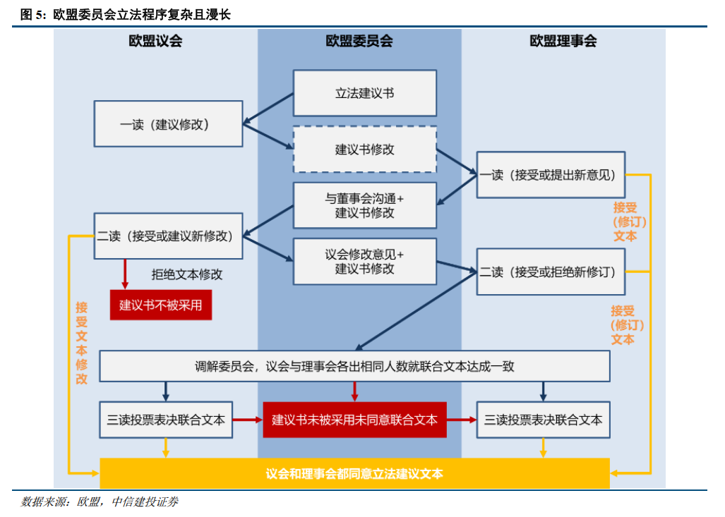 1)立法程序复杂漫长:当前欧盟仅发布《工业加速法案》的提案,后续还需经过多轮修改并投票,从提案到正式立法通常需要1年以上时间(参考《净零工业法案》最终耗时14-15个月);