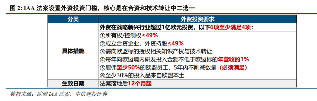 外国投资方面,IAA法案共提出6个要求,其中必须满足的要求是至少雇佣50%以上的欧盟员工,其余5个要求中需要再满足3个。考虑到6条要求中有2条都是外资49%以下相关要求,因此同时符合剩余4条有一定难度,可以理解为本质上是要中国企业在技术授权和合资中二选一。