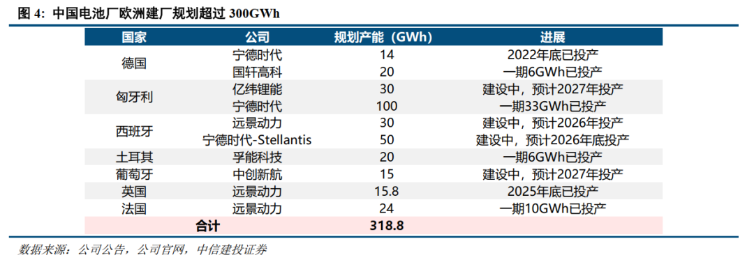 对于已经落地的投资,考虑到法案中的流程是先由企业递交申请、欧盟委员会审批、再开始建设,以及外资投资相关要求是法案落地后12个月起,因此我们预计已经落地的投资大概率不会受影响。我们统计目前包括宁德时代亿纬锂能国轩高科、中创新航、远景能源、孚能科技等电池厂在内欧洲规划产能合计达到318.8GWh,其中已投产产能85.8GWh,叠加1年内即将落地产能后合计210.8GWh。