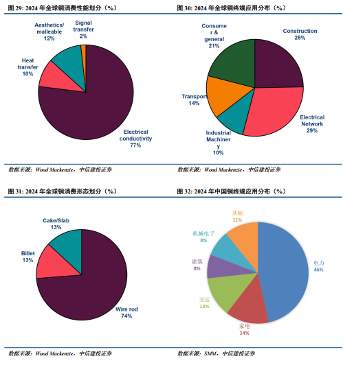 铜是具备性价比的导电材料。根据Wood Mackenzie数据,2024年铜按照使用性能划分,导电性能77%,延展性能11%,热传导性能10%,信号传输性能2%;按终端应用场景划分,电网29%,建筑25%,消费品21%,交运14%,工业11%。优异且具性价比的导电性能,使其在当下新旧能源转化的时代获得强有力的消费驱动,具体到终端应用上,电网、地产、新能源车等领域均有提升空间。中国终端用铜分布电力46%、家电14%、交运13%、建筑8%、机械电子8%、其他11%。