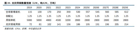 光伏领域的金属铜主要集中于下游的发电输电环节,例如用于制造光伏集热器的铜管、高低压电缆及其传输过程中的电力设备。参照ICSG的研究,光伏用铜单耗在近几年有下降趋势,2024年铜价创下历史新高,政府补贴退坡,光伏行业竞争加剧,降本压力空前,光伏领域的铝代铜进一步深入。光伏中的铝代铜场合有连接光伏电池并将电力传输至逆变器、连接逆变器和箱式变压器、连接箱式变压器和主变压器、输电线路,铝代铜已经压缩到极致的0.28万吨/GW。预计2025年光伏耗铜约195万吨,占全球铜消费比重达7%,预计2025-2028年光伏领域用铜增长分别为9万吨、-4万吨、9万吨、9万吨。